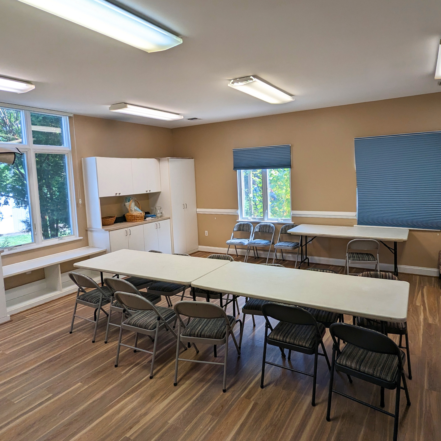 This versatile and bright reception-style space, perfect for medium-sized group gatherings and receptions. With large windows that fill the room with natural light, the space includes a kitchenette, folding chairs, and tables of varying sizes. It also provides direct access to the serene Restoring Eden Garden, creating a beautiful indoor-outdoor experience for your guests.